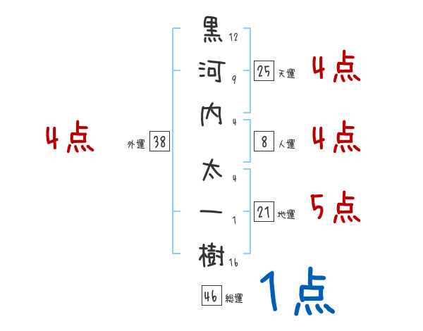 天運![]() | 黒河内太一樹さんの天運は25画の4つ星!個性があり才能があふれる。強運の持ち主で発展する。 家系が持つ宿命的な運勢を表します。祖先から受け継いだ苗字ですので自分の力が及びません。家柄を象徴します。 |