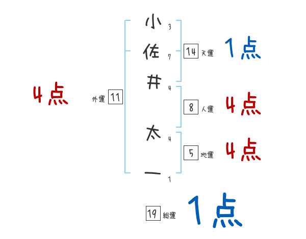 総運![]() | 小佐井太一さんの総運は19画の1つ星!優れた才能を持ちますが、協調性が足りないことも。周りの人と協力する事を意識しましょう。 あなたの人生を表す1番重要な運勢です。生涯を通じて影響する総合運となり、主に50歳以降の晩年期に影響を及ぼします。 |