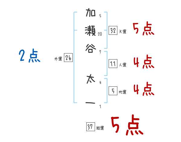 天運![]() | 加瀬谷太一さんの天運は32画の5つ星!柔軟性があり成功する。チャンスが多く金運が良い。 家系が持つ宿命的な運勢を表します。祖先から受け継いだ苗字ですので自分の力が及びません。家柄を象徴します。 |