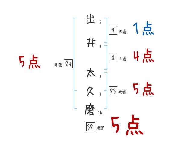 総運![]() | 出井太久磨さんの総運は32画の5つ星!柔軟性があり成功する。チャンスが多く金運が良い。 あなたの人生を表す1番重要な運勢です。生涯を通じて影響する総合運となり、主に50歳以降の晩年期に影響を及ぼします。 |