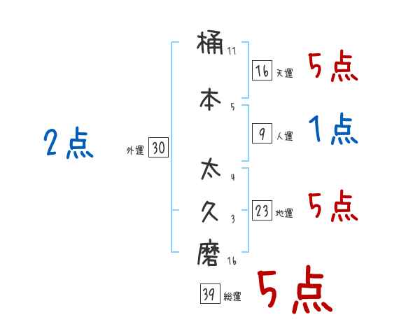 総運![]() | 桶本太久磨さんの総運は39画の5つ星!社交性に優れ人望が厚い。人の上に立ち成功する。 あなたの人生を表す1番重要な運勢です。生涯を通じて影響する総合運となり、主に50歳以降の晩年期に影響を及ぼします。 |