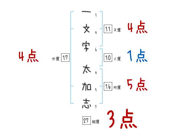 外運![]() | 一文字太加志さんの外運は17画の4つ星!積極的な行動力。地位を気づき財産を手に入れる。純粋な心と直感力。 生活面を象徴する運勢です。外部から受ける影響力を表し、結婚運、家庭運や職場、環境への順応性を表します。 |