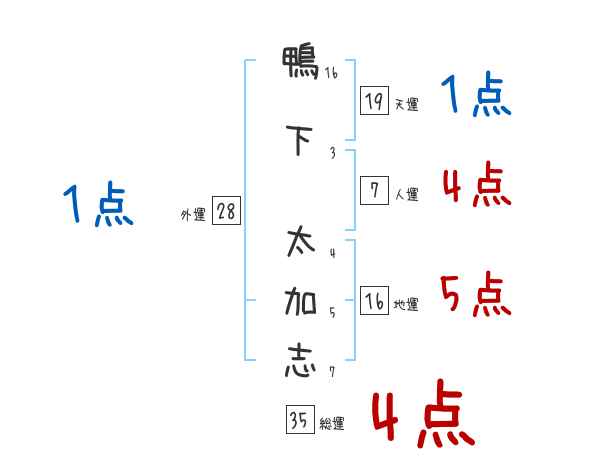 総運![]() | 鴨下太加志さんの総運は35画の4つ星!温厚な性格で感受性が高い。穏和な性格で人望が厚い。 あなたの人生を表す1番重要な運勢です。生涯を通じて影響する総合運となり、主に50歳以降の晩年期に影響を及ぼします。 |