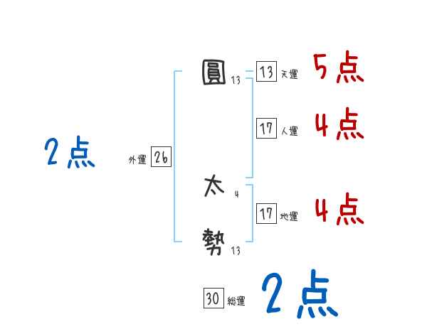 天運![]() | 圓太勢さんの天運は13画の5つ星!才能に恵まれ人気がある。名声を手に入れる。円満な人生。 家系が持つ宿命的な運勢を表します。祖先から受け継いだ苗字ですので自分の力が及びません。家柄を象徴します。 |