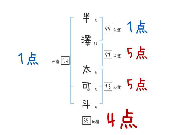 天運![]() | 半澤太可斗さんの天運は22画の1つ星!努力することが苦手ないっぽう手先が器用。芸術性にも優れる。 家系が持つ宿命的な運勢を表します。祖先から受け継いだ苗字ですので自分の力が及びません。家柄を象徴します。 |