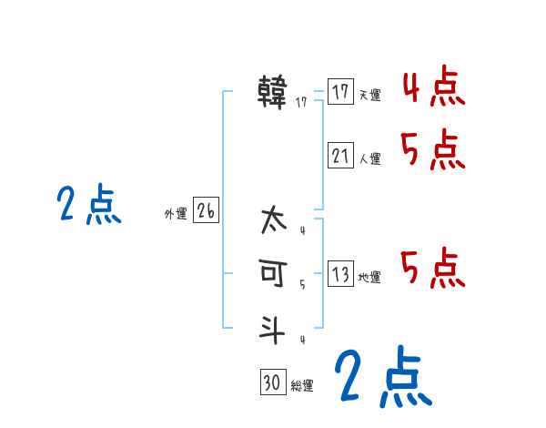 総運![]() | 韓太可斗さんの総運は30画の2つ星!浮き沈みの激しさに注意しましょう。 あなたの人生を表す1番重要な運勢です。生涯を通じて影響する総合運となり、主に50歳以降の晩年期に影響を及ぼします。 |