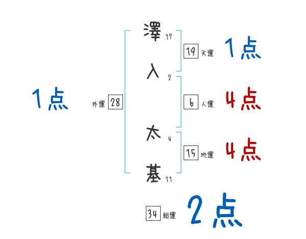 総運![]() | 澤入太基さんの総運は34画の2つ星!独創性に優れるが、自尊心が強く災難に注意しましょう。 あなたの人生を表す1番重要な運勢です。生涯を通じて影響する総合運となり、主に50歳以降の晩年期に影響を及ぼします。 |