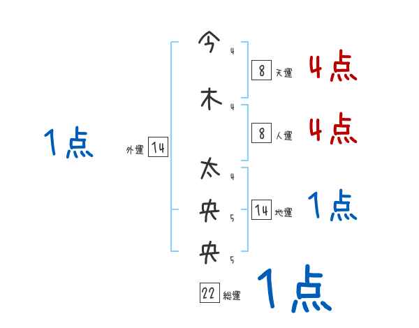 外運![]() | 今木太央央さんの外運は14画の1つ星!人に対して優しいがストレスを溜め込みがち。人間関係のトラブルを避けるよう気をつけましょう。 生活面を象徴する運勢です。外部から受ける影響力を表し、結婚運、家庭運や職場、環境への順応性を表します。 |