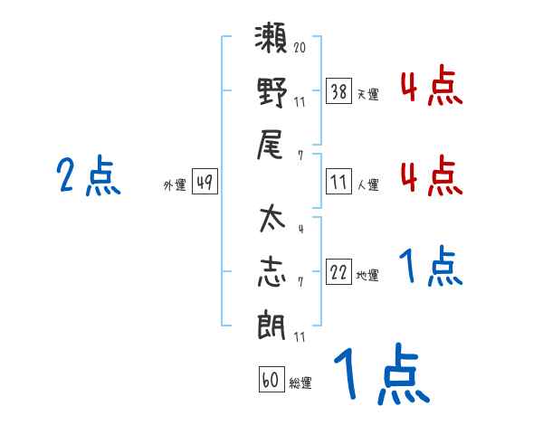 地運![]() | 瀬野尾太志朗さんの地運は22画の1つ星!努力することが苦手ないっぽう手先が器用。芸術性にも優れる。 個性を表す基礎的な運勢です。性格形成や対人関係、行動力など家庭環境に影響されます。主に誕生してから20歳くらいまでの若年期の運勢を表します。 |