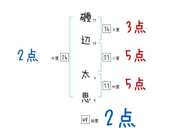 外運![]() | 磯辺太思さんの外運は26画の2つ星!波瀾万丈かも。信頼できる人を大事にしましょう。 生活面を象徴する運勢です。外部から受ける影響力を表し、結婚運、家庭運や職場、環境への順応性を表します。 |