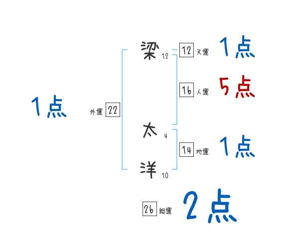 人運![]() | 梁太洋さんの人運は16画の5つ星!人望が厚く大きく発展する。逆転成功が見える。 性格や才能などを表す2番目に重要な運勢です。人間関係や協調性、社会的な成功に影響します。主に20歳から50歳ぐらいまでの中年期の運勢を表します。 |