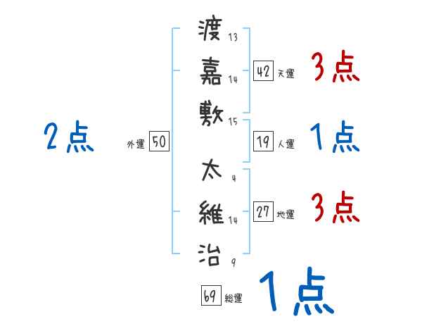 外運![]() | 渡嘉敷太維治さんの外運は50画の2つ星!浮き沈みが激しく不安定。しりすぼみに衰退しやすいので注意しましょう。 生活面を象徴する運勢です。外部から受ける影響力を表し、結婚運、家庭運や職場、環境への順応性を表します。 |
