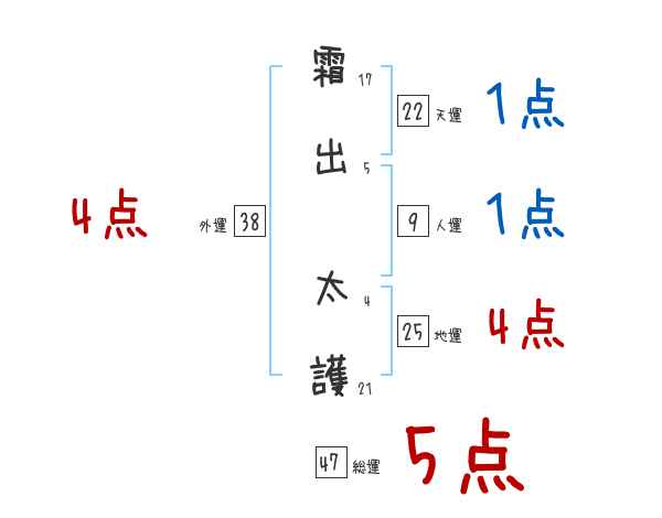 総運![]() | 霜出太護さんの総運は47画の5つ星!実力が開花し発展する円満な人生。財に恵まれる。 あなたの人生を表す1番重要な運勢です。生涯を通じて影響する総合運となり、主に50歳以降の晩年期に影響を及ぼします。 |