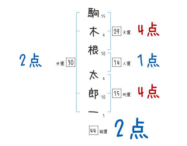 総運![]() | 駒木根太郎一さんの総運は44画の2つ星!誠実で慎重な性格。物事を考えすぎないように注意しましょう。 あなたの人生を表す1番重要な運勢です。生涯を通じて影響する総合運となり、主に50歳以降の晩年期に影響を及ぼします。 |