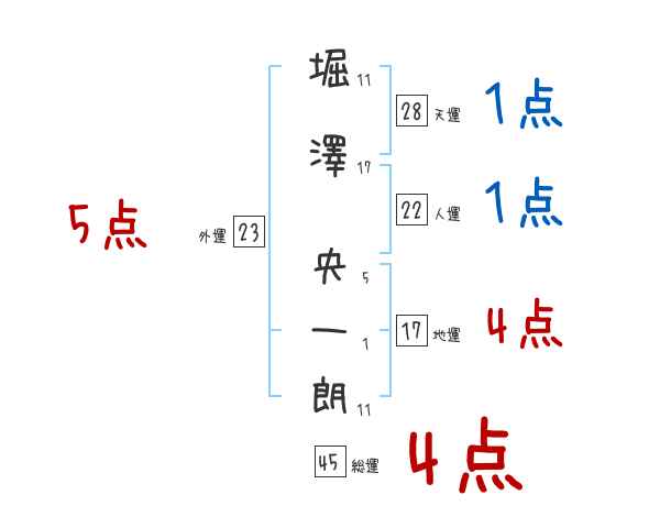 外運![]() | 堀澤央一朗さんの外運は23画の5つ星!想像力に優れ活力がある。一代で成功し名誉を手に入れる。 生活面を象徴する運勢です。外部から受ける影響力を表し、結婚運、家庭運や職場、環境への順応性を表します。 |