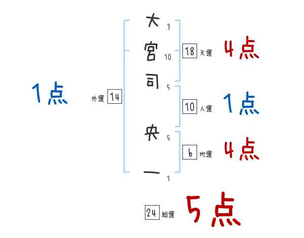 外運![]() | 大宮司央一さんの外運は14画の1つ星!人に対して優しいがストレスを溜め込みがち。人間関係のトラブルを避けるよう気をつけましょう。 生活面を象徴する運勢です。外部から受ける影響力を表し、結婚運、家庭運や職場、環境への順応性を表します。 |
