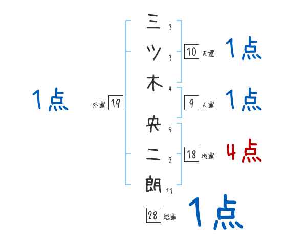天運![]() | 三ツ木央二朗さんの天運は10画の1つ星!不安を感じやすい傾向。ストレスを抱えないように注意しましょう。 家系が持つ宿命的な運勢を表します。祖先から受け継いだ苗字ですので自分の力が及びません。家柄を象徴します。 |