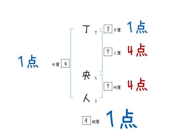 外運![]() | 丁央人さんの外運は4画の1つ星!感情が不安定で苦労するかも。周囲との協調を心掛けましょう。 生活面を象徴する運勢です。外部から受ける影響力を表し、結婚運、家庭運や職場、環境への順応性を表します。 |