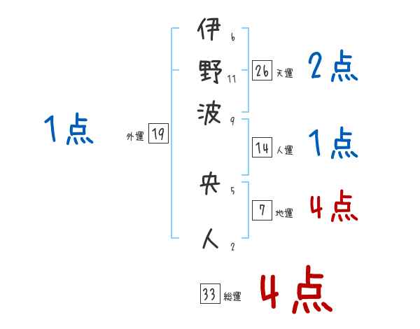 外運![]() | 伊野波央人さんの外運は19画の1つ星!優れた才能を持ちますが、協調性が足りないことも。周りの人と協力する事を意識しましょう。 生活面を象徴する運勢です。外部から受ける影響力を表し、結婚運、家庭運や職場、環境への順応性を表します。 |