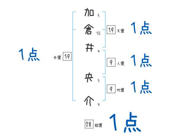 天運![]() | 加倉井央介さんの天運は19画の1つ星!優れた才能を持ちますが、協調性が足りないことも。周りの人と協力する事を意識しましょう。 家系が持つ宿命的な運勢を表します。祖先から受け継いだ苗字ですので自分の力が及びません。家柄を象徴します。 |