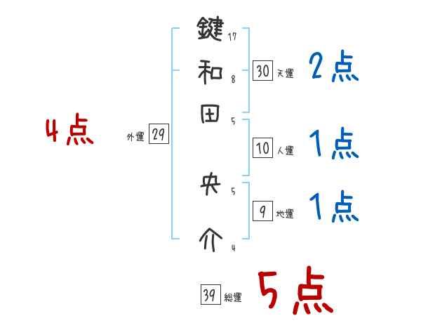 天運![]() | 鍵和田央介さんの天運は30画の2つ星!浮き沈みの激しさに注意しましょう。 家系が持つ宿命的な運勢を表します。祖先から受け継いだ苗字ですので自分の力が及びません。家柄を象徴します。 |