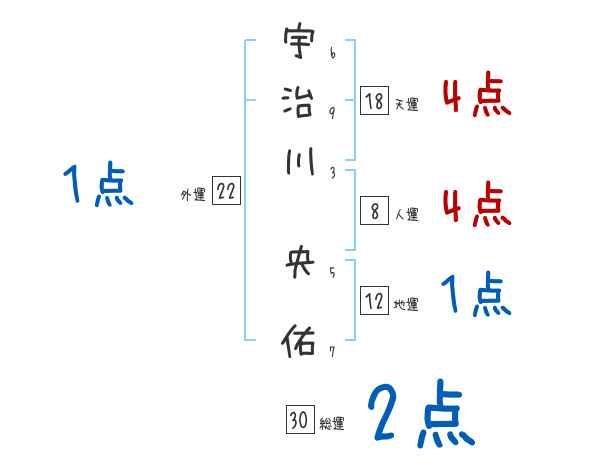 天運![]() | 宇治川央佑さんの天運は18画の4つ星!情熱的で剛気。忍耐力があり信頼される。 家系が持つ宿命的な運勢を表します。祖先から受け継いだ苗字ですので自分の力が及びません。家柄を象徴します。 |