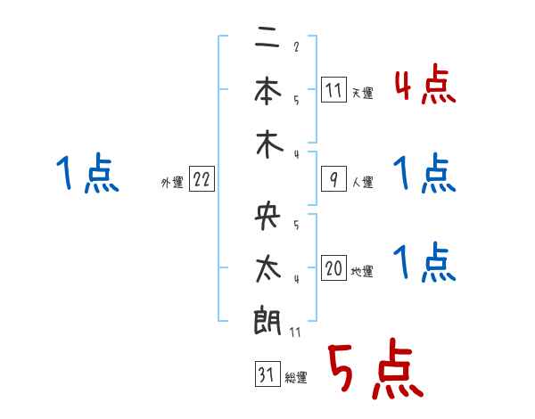 天運![]() | 二本木央太朗さんの天運は11画の4つ星!着実に富や地位を得る幸運な人生。 家系が持つ宿命的な運勢を表します。祖先から受け継いだ苗字ですので自分の力が及びません。家柄を象徴します。 |