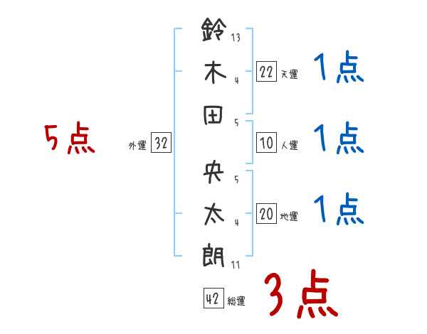 外運![]() | 鈴木田央太朗さんの外運は32画の5つ星!柔軟性があり成功する。チャンスが多く金運が良い。 生活面を象徴する運勢です。外部から受ける影響力を表し、結婚運、家庭運や職場、環境への順応性を表します。 |