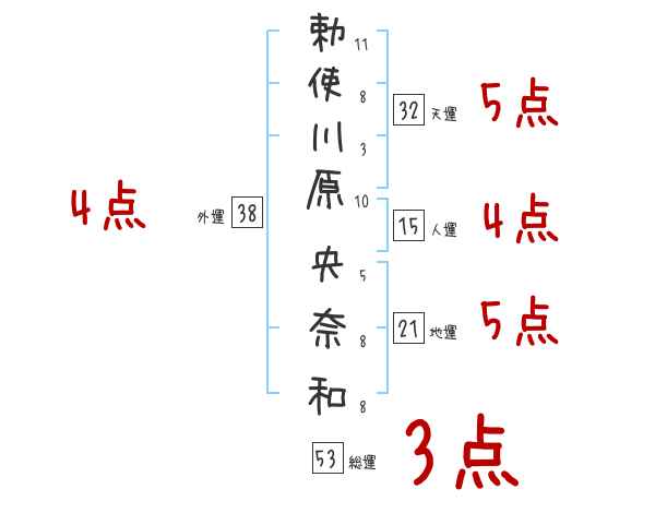 天運![]() | 勅使川原央奈和さんの天運は32画の5つ星!柔軟性があり成功する。チャンスが多く金運が良い。 家系が持つ宿命的な運勢を表します。祖先から受け継いだ苗字ですので自分の力が及びません。家柄を象徴します。 |