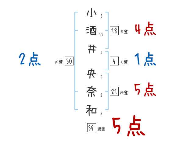 総運![]() | 小酒井央奈和さんの総運は39画の5つ星!社交性に優れ人望が厚い。人の上に立ち成功する。 あなたの人生を表す1番重要な運勢です。生涯を通じて影響する総合運となり、主に50歳以降の晩年期に影響を及ぼします。 |