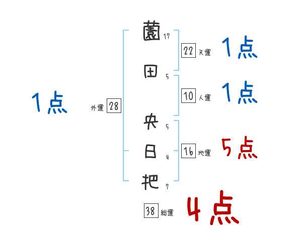 | 天運  | 薗田央日把さんの天運は22画の1つ星!努力することが苦手ないっぽう手先が器用。芸術性にも優れる。家系が持つ宿命的な運勢を表します。祖先から受け継いだ苗字ですので自分の力が及びません。家柄を象徴します。 |