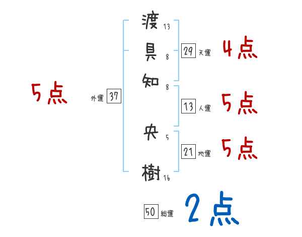 外運![]() | 渡具知央樹さんの外運は37画の5つ星!努力家で順応性に優れる。現実的な考え方ができ忠実に物事をこなす。 生活面を象徴する運勢です。外部から受ける影響力を表し、結婚運、家庭運や職場、環境への順応性を表します。 |