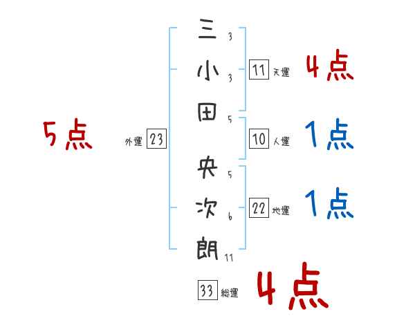 天運![]() | 三小田央次朗さんの天運は11画の4つ星!着実に富や地位を得る幸運な人生。 家系が持つ宿命的な運勢を表します。祖先から受け継いだ苗字ですので自分の力が及びません。家柄を象徴します。 |