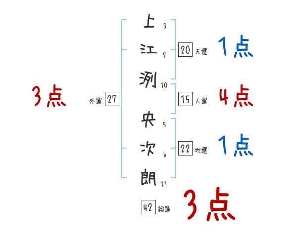 人運![]() | 上江洌央次朗さんの人運は15画の4つ星!人徳があり出世する。順調に物事を進め円満な人生。 性格や才能などを表す2番目に重要な運勢です。人間関係や協調性、社会的な成功に影響します。主に20歳から50歳ぐらいまでの中年期の運勢を表します。 |