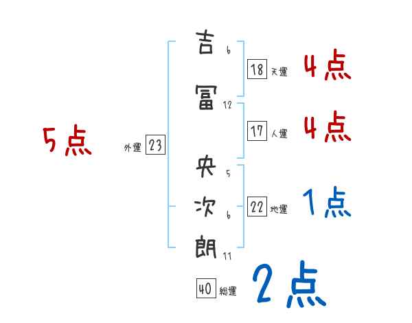 外運![]() | 吉冨央次朗さんの外運は23画の5つ星!想像力に優れ活力がある。一代で成功し名誉を手に入れる。 生活面を象徴する運勢です。外部から受ける影響力を表し、結婚運、家庭運や職場、環境への順応性を表します。 |