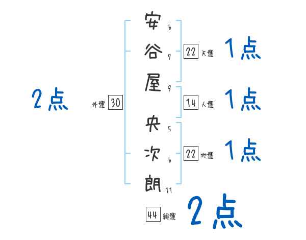 総運![]() | 安谷屋央次朗さんの総運は44画の2つ星!誠実で慎重な性格。物事を考えすぎないように注意しましょう。 あなたの人生を表す1番重要な運勢です。生涯を通じて影響する総合運となり、主に50歳以降の晩年期に影響を及ぼします。 |