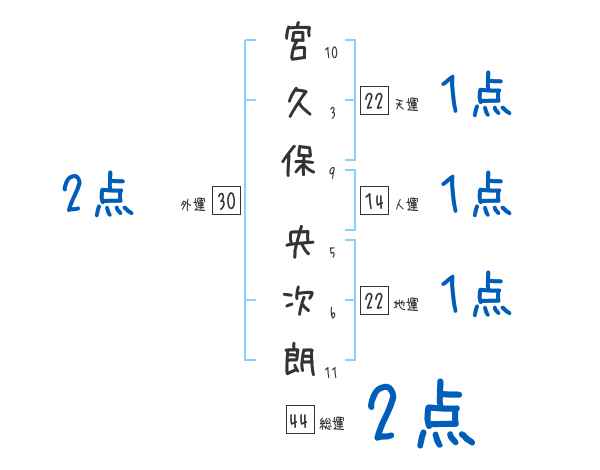 天運![]() | 宮久保央次朗さんの天運は22画の1つ星!努力することが苦手ないっぽう手先が器用。芸術性にも優れる。 家系が持つ宿命的な運勢を表します。祖先から受け継いだ苗字ですので自分の力が及びません。家柄を象徴します。 |