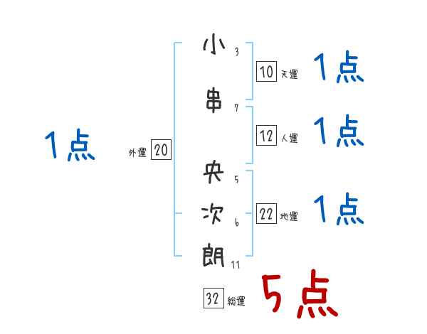 総運![]() | 小串央次朗さんの総運は32画の5つ星!柔軟性があり成功する。チャンスが多く金運が良い。 あなたの人生を表す1番重要な運勢です。生涯を通じて影響する総合運となり、主に50歳以降の晩年期に影響を及ぼします。 |
