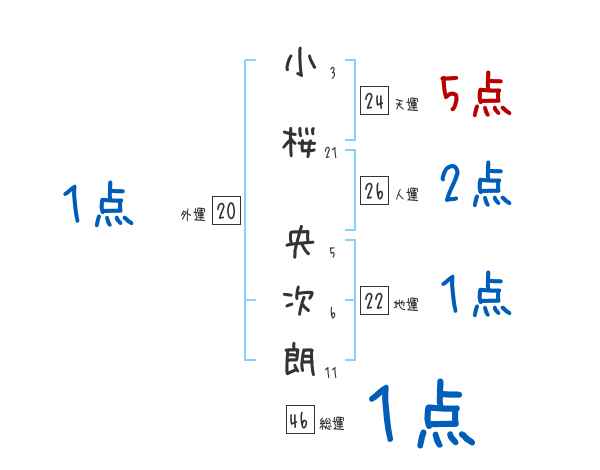 天運![]() | 小桜央次朗さんの天運は24画の5つ星!家庭運が良く順調な人生。金運にも恵まれる。 家系が持つ宿命的な運勢を表します。祖先から受け継いだ苗字ですので自分の力が及びません。家柄を象徴します。 |