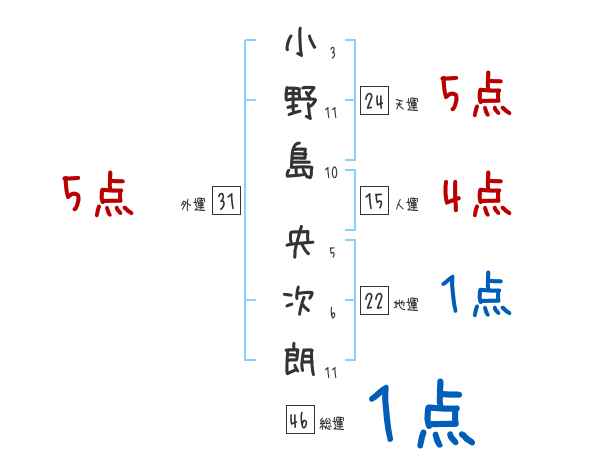 地運![]() | 小野島央次朗さんの地運は22画の1つ星!努力することが苦手ないっぽう手先が器用。芸術性にも優れる。 個性を表す基礎的な運勢です。性格形成や対人関係、行動力など家庭環境に影響されます。主に誕生してから20歳くらいまでの若年期の運勢を表します。 |