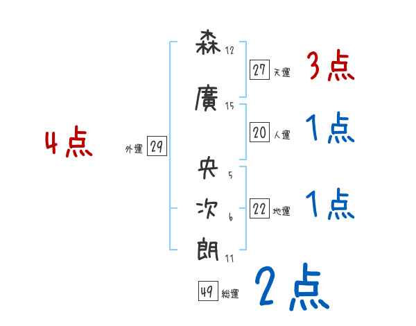 外運![]() | 森廣央次朗さんの外運は29画の4つ星!完全主義で才能がある。厳格な心の持ち主。 生活面を象徴する運勢です。外部から受ける影響力を表し、結婚運、家庭運や職場、環境への順応性を表します。 |
