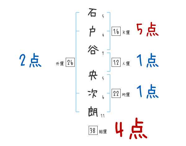 外運![]() | 石戸谷央次朗さんの外運は26画の2つ星!波瀾万丈かも。信頼できる人を大事にしましょう。 生活面を象徴する運勢です。外部から受ける影響力を表し、結婚運、家庭運や職場、環境への順応性を表します。 |