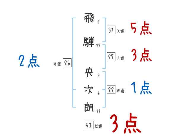 総運![]() | 飛騨央次朗さんの総運は53画の3つ星!やや見栄っ張りで虚栄心がある。散財に注意。 あなたの人生を表す1番重要な運勢です。生涯を通じて影響する総合運となり、主に50歳以降の晩年期に影響を及ぼします。 |