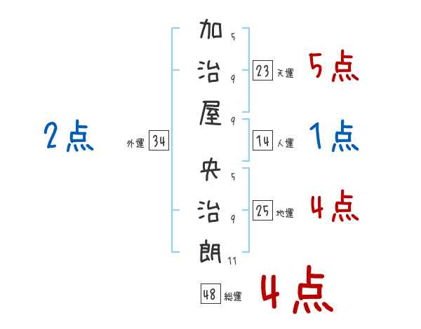 天運![]() | 加治屋央治朗さんの天運は23画の5つ星!想像力に優れ活力がある。一代で成功し名誉を手に入れる。 家系が持つ宿命的な運勢を表します。祖先から受け継いだ苗字ですので自分の力が及びません。家柄を象徴します。 |