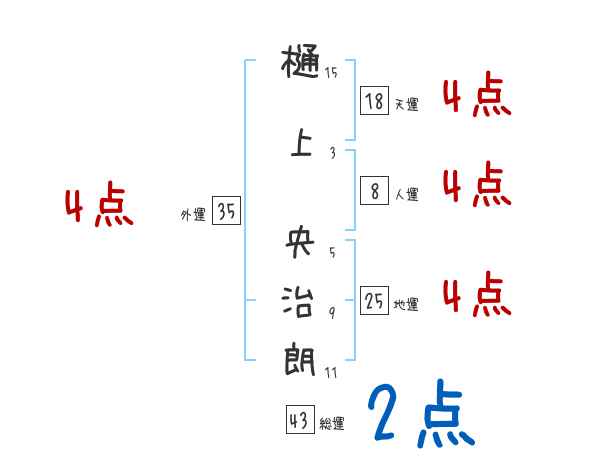 総運![]() | 樋上央治朗さんの総運は43画の2つ星!頑固な性格で独立心が強いかも。やや非現実的で浪費に注意しましょう。 あなたの人生を表す1番重要な運勢です。生涯を通じて影響する総合運となり、主に50歳以降の晩年期に影響を及ぼします。 |