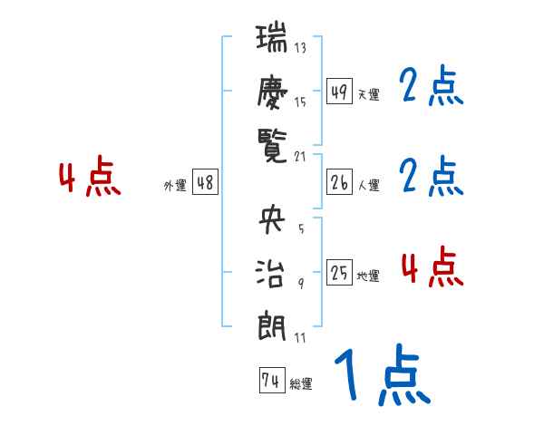 天運![]() | 瑞慶覧央治朗さんの天運は49画の2つ星!不安定な性格で明暗がある人生。周りの人には支援されやすい。 家系が持つ宿命的な運勢を表します。祖先から受け継いだ苗字ですので自分の力が及びません。家柄を象徴します。 |