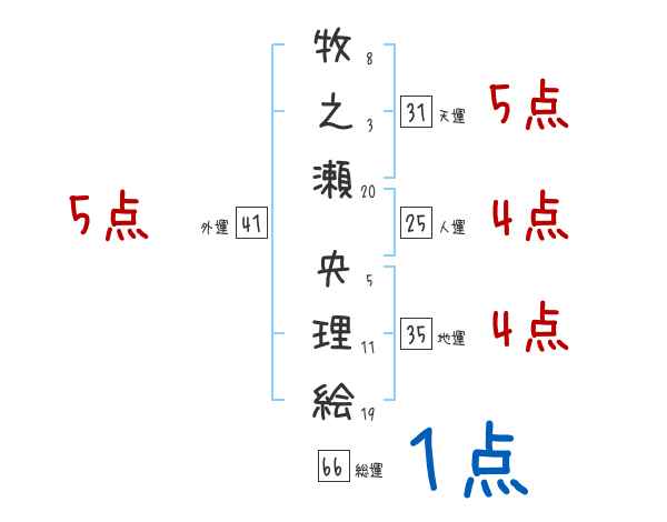 総運![]() | 牧之瀬央理絵さんの総運は66画の1つ星!迷うことが多く挫折しやすい傾向が。辛抱強く物事に取り組みましょう。 あなたの人生を表す1番重要な運勢です。生涯を通じて影響する総合運となり、主に50歳以降の晩年期に影響を及ぼします。 |
