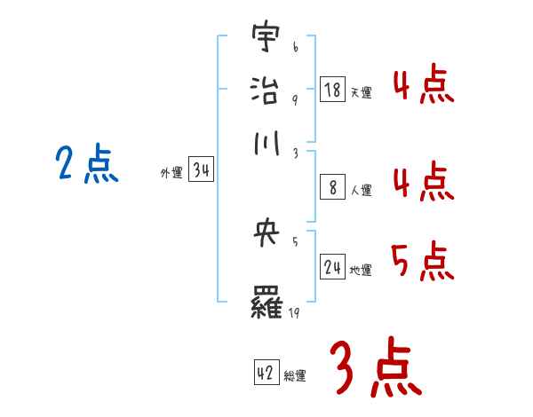 天運![]() | 宇治川央羅さんの天運は18画の4つ星!情熱的で剛気。忍耐力があり信頼される。 家系が持つ宿命的な運勢を表します。祖先から受け継いだ苗字ですので自分の力が及びません。家柄を象徴します。 |