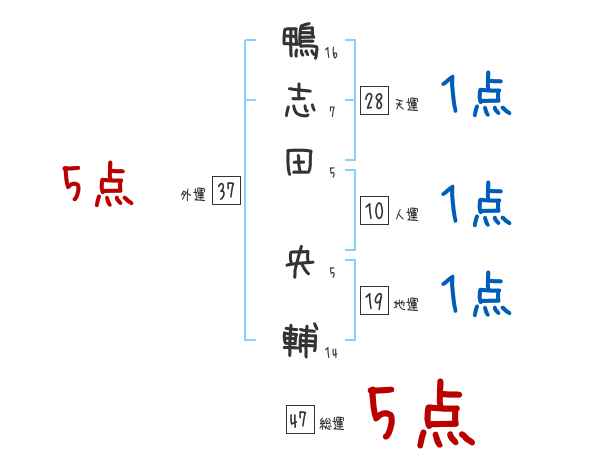 天運![]() | 鴨志田央輔さんの天運は28画の1つ星!家庭環境に注意。スポーツで活躍できる能力があるかも。 家系が持つ宿命的な運勢を表します。祖先から受け継いだ苗字ですので自分の力が及びません。家柄を象徴します。 |