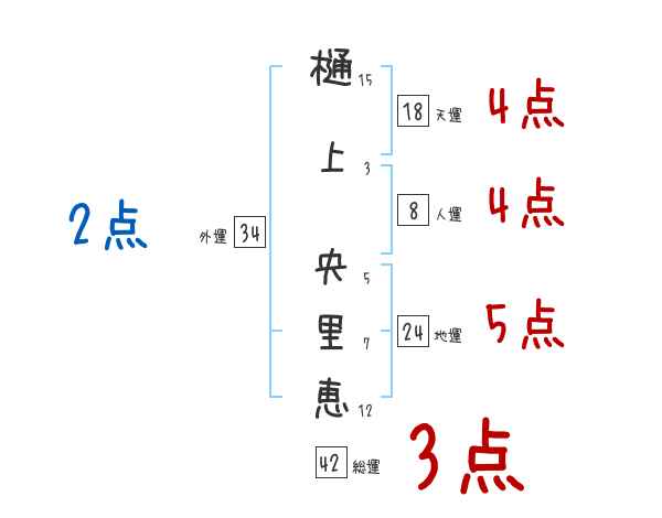 天運![]() | 樋上央里恵さんの天運は18画の4つ星!情熱的で剛気。忍耐力があり信頼される。 家系が持つ宿命的な運勢を表します。祖先から受け継いだ苗字ですので自分の力が及びません。家柄を象徴します。 |